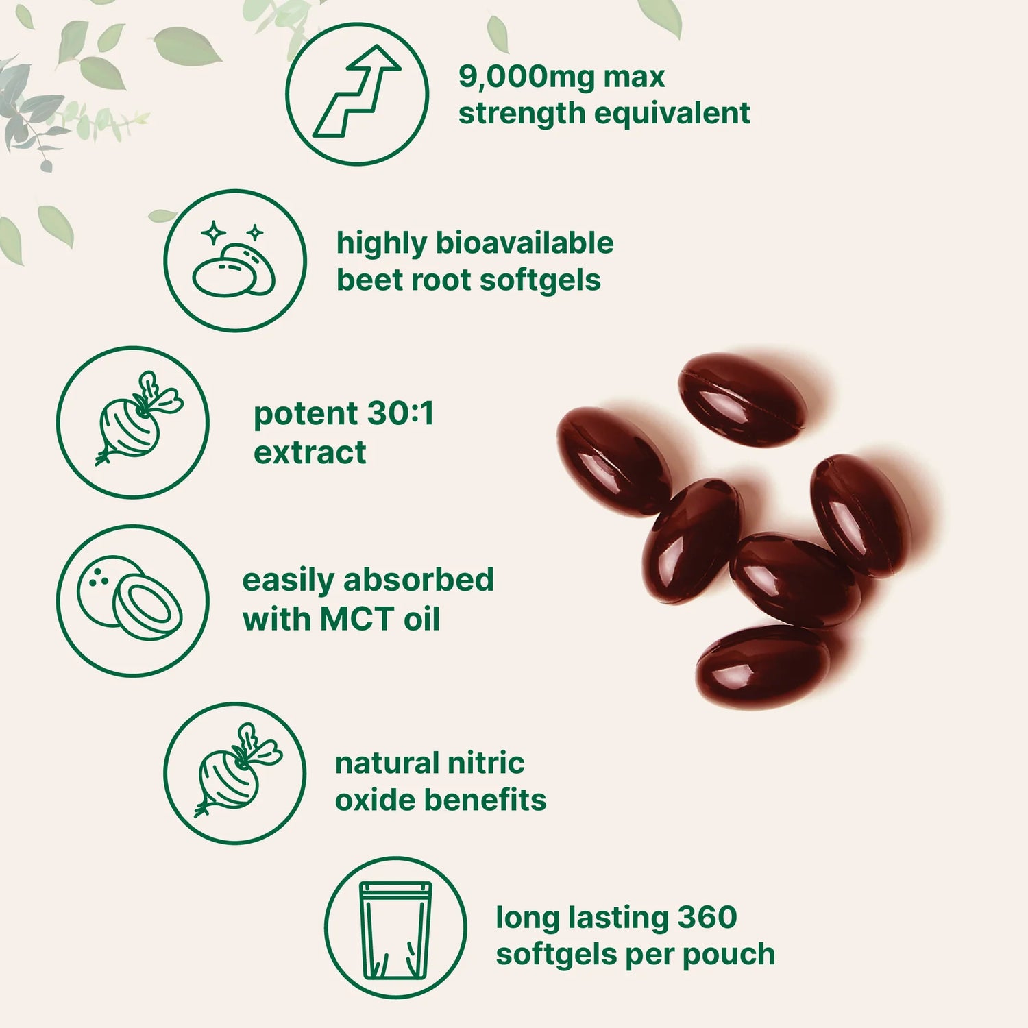 Most beet root supplements use basic powder or juice concentrate that loses potency during processing. Our 30:1 extract removes water and fiber, keeping only the active compounds your body needs: nitrates, antioxidants, betaine, and flavonoids. We then add MCT oil to enhance absorption, so you get more bioavailable nutrition per softgel than competitors charging twice the price.